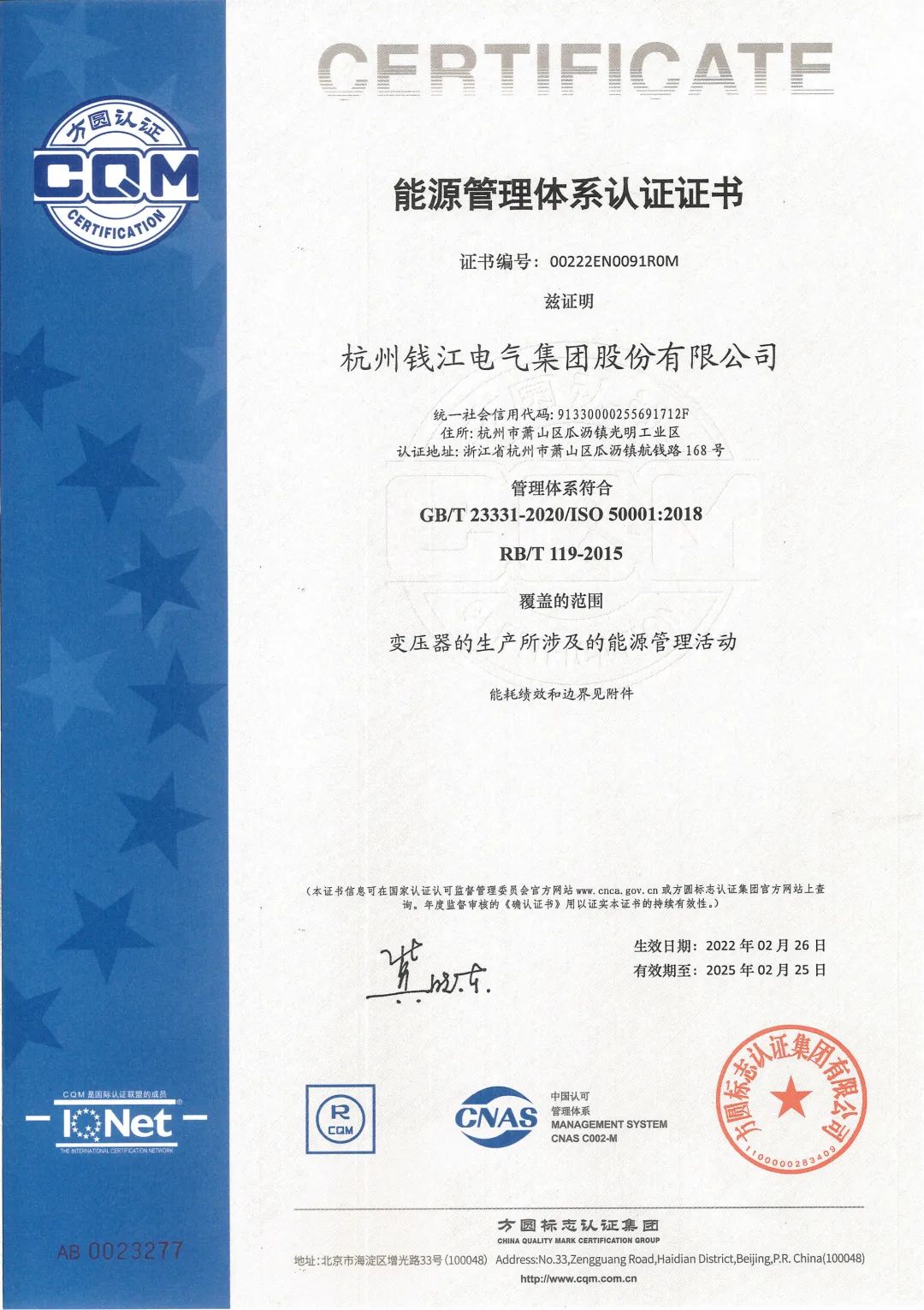 公司于2月份获得由中国认可管理体系及方圆标志认证颁发的能源管理体系认证证书(证书编号为:00222EN0091R0M)。标志着我公司符合GB/T 23331-2020/ISO 50001:2018 《能源管理体系 要求》和RB/T 119-2015《能源管理体系 机械制造企业认证要求》 标准的要求。能源管理体系将在我公司正式启动运行。