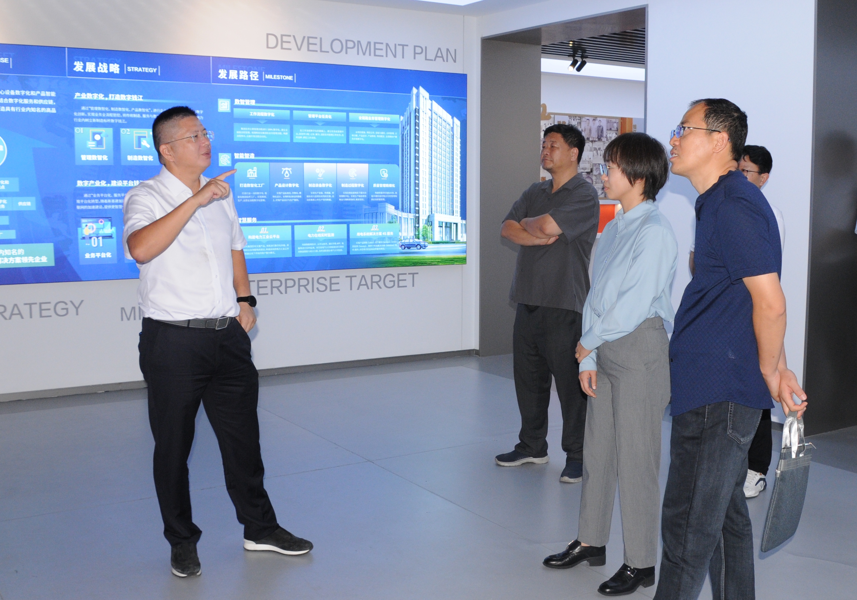 项勇陪同上级领导参观了公司展厅,介绍了公司的发展历程、行业地位、产品研发、技术改造、节能降耗、数字化工厂建设和综合能源管理系统、数智大脑管理系统应用等。